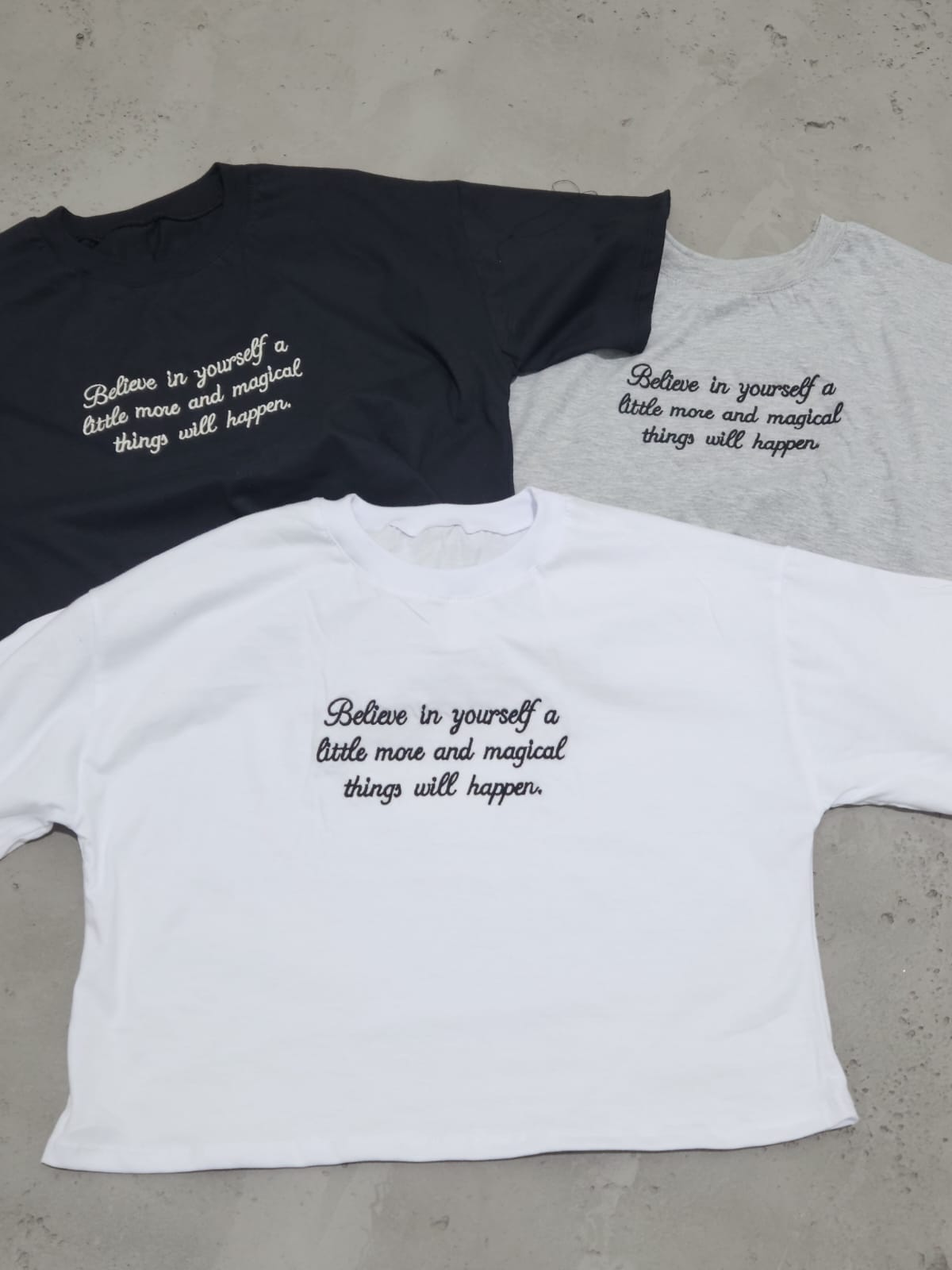 Remera Boxy Bordada BELIEVE IN YOURSELF A LITTLE MORE Algodón 100% Talle : Único M Colores : Blanco/Gris/Negro